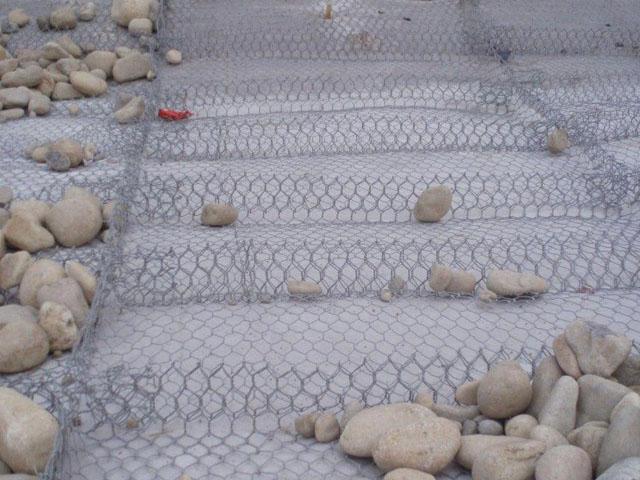 雷諾護(hù)墊也叫石籠護(hù)墊,格賓護(hù)墊,是指由機(jī)編雙絞合六邊形金屬網(wǎng)面構(gòu)成的厚度遠(yuǎn)小于長(zhǎng)度和寬度的墊形工程構(gòu)件。雷諾護(hù)墊中裝入塊石等填充料后連接成一體,成為主要用于水利堤防、岸坡、海曼等的防沖刷結(jié)構(gòu),具有柔性、對(duì)地基適應(yīng)性的優(yōu)點(diǎn)。