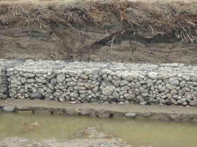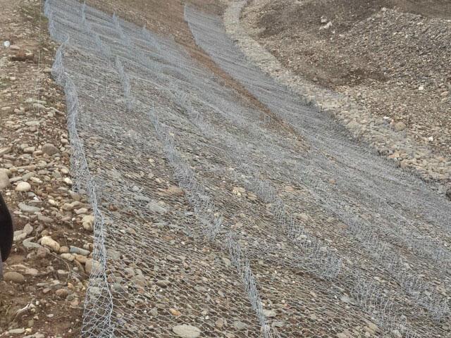 雷諾護(hù)墊是厚度在0.17-0.3m的網(wǎng)箱結(jié)構(gòu),在現(xiàn)場(chǎng)用于裝填石頭。主要用作河道、岸坡、路基邊坡護(hù)坡結(jié)構(gòu)。既可防止河岸遭水流、風(fēng)浪侵襲而破壞,又實(shí)現(xiàn)了水體與坡下土體間的自然對(duì)流交換功能,達(dá)到生態(tài)平衡。坡上植綠可增添景觀、綠化效果。